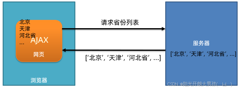 浏览器网页中,使用 AJAX技术(XHR对象)发起获取省份列表数据的请求,服务器代码响应准备好的省份列表数据给前端,前端拿到数据数组以后,展示到网页