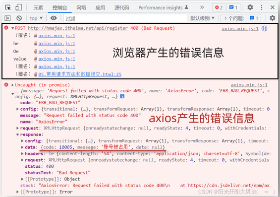 javascript// 目标1:点击登录时,用户名和密码长度判断,并提交数据和服务器通信 // 1.1 登录-点击事件 document.querySelector('.btn-login').addEventListener('click', () => { // 1.2 获取用户名和密码 const username = document.querySelector('.username').value const password = document.querySelector('.password').value // console.log(username, password) // 1.3 判断长度 if (username.length < 8) { console.log('用户名必须大于等于8位') return // 阻止代码继续执行 } if (password.length < 6) { console.log('密码必须大于等于6位') return // 阻止代码继续执行 } // 1.4 基于axios提交用户名和密码 // console.log('提交数据到服务器') axios({ url: 'http://hmajax.itheima.net/api/login', method: 'POST', data: { username, password } }).then(result => { console.log(result) console.log(result.data.message) }).catch(error => { console.log(error) console.log(error.response.data.message) }) })