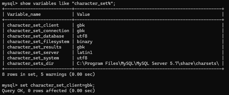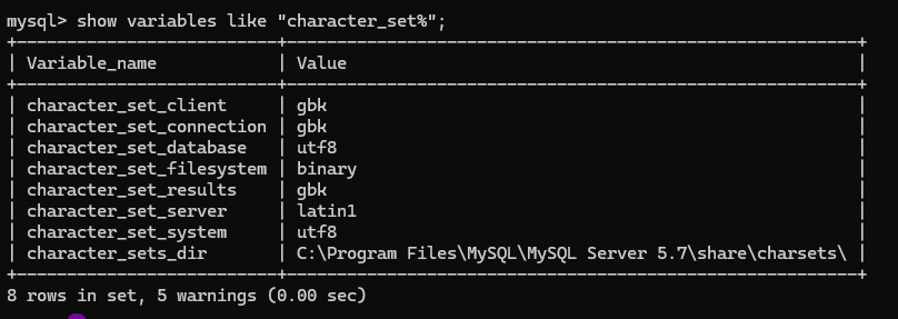 show variables like "character_set%";这条命令可以看到当前的mysql各个部分都是使用的哪个编码方式,注意这里是双引号