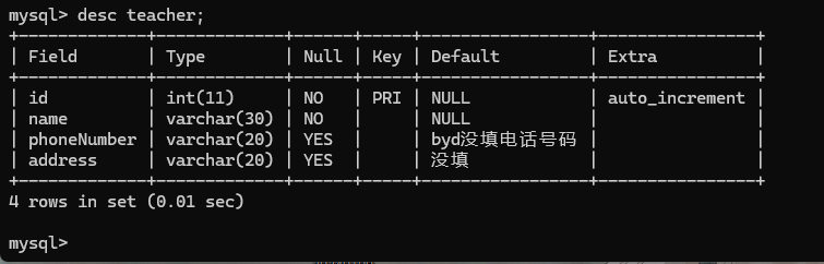insert into + teacher + (id, name, phoneNumber, address) + values(1, 'yyy', '8848', 'chengdu');