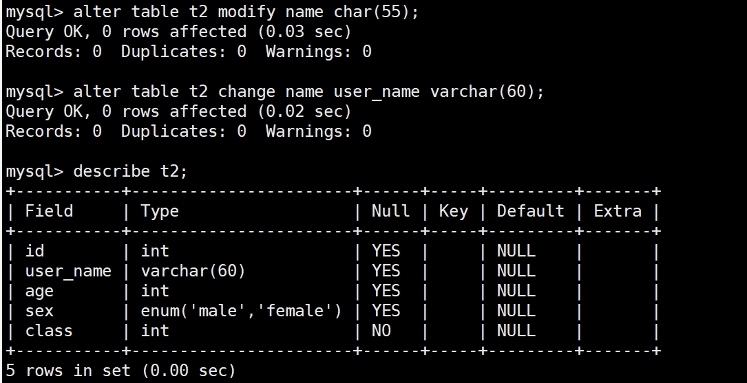 describe语句:用于显示表的结构,即组成表的各字段的信息。