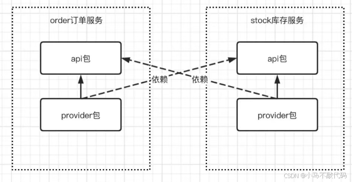 其次,在实际的 Dubbo 服务开发过程中,为了解决api接口包混乱的问题,微服务之间的交互逻辑,通常会采用如下方式来解决。