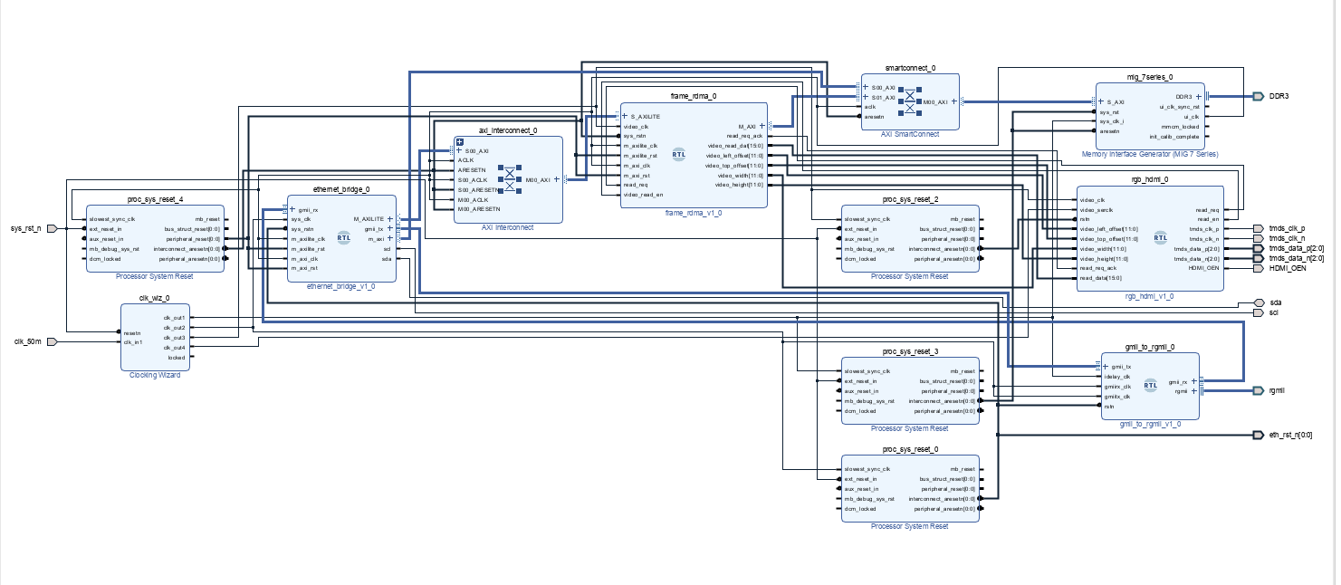 整个视频处理系统采用FPGA作为核心处理器,通过定制化的UDP协议IP核实现高速视频流接收,结合DDR3内存实现数据缓冲,最终通过DMA控制器和HDMI接口完成视频显示输出。