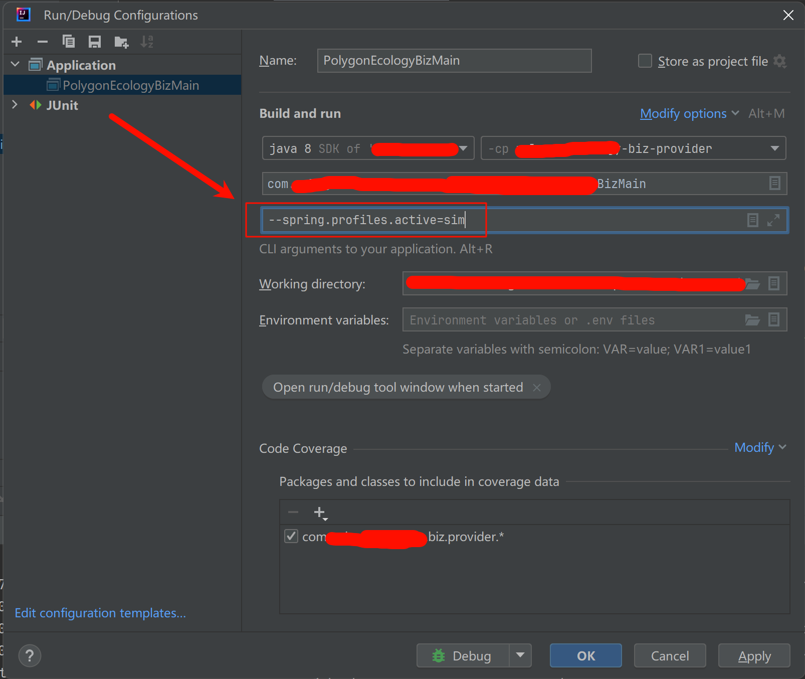 在输入框Program arguments中,输入 【--spring.profiles.active=sim】