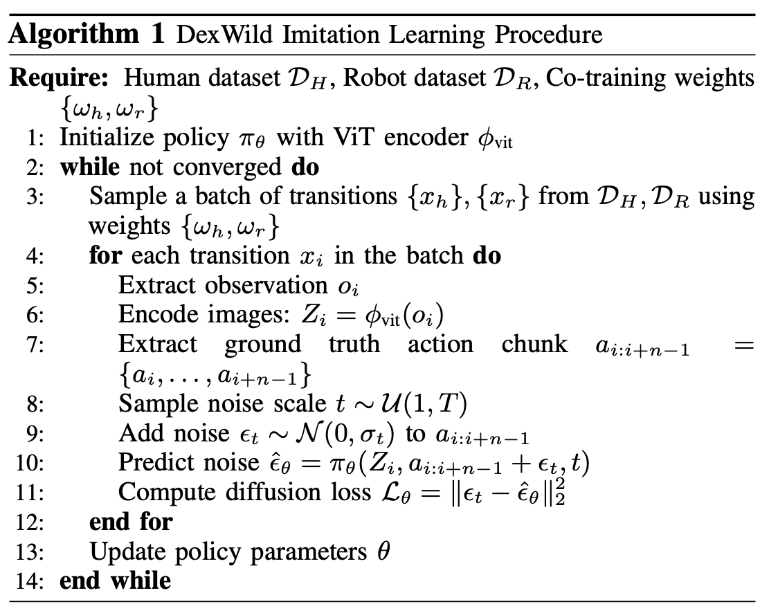 人类数据具有广泛的任务多样性,并且在现实环境中易于收集,但缺乏具体化一致性。机器人数据虽然规模有限,但却为机器人的动作和观察空间提供了至关重要的基础。为了充分利用两者的优势,用一个批次中固定比例的人类和机器人数据 (w_h, w_r) 共同训练策略------在多样性和具身基础之间取得平衡,从而在部署期间实现稳健的泛化。