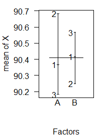plot.design(X~A*B,data=yield)