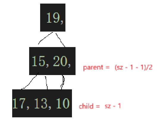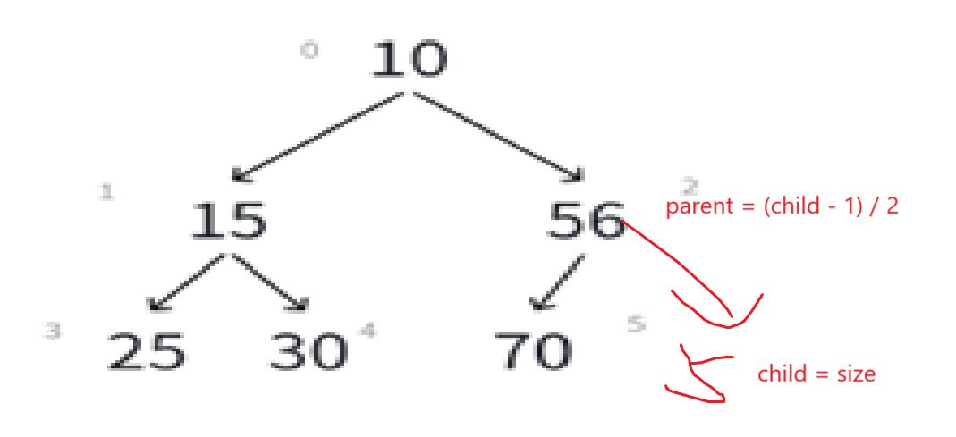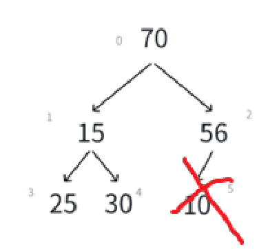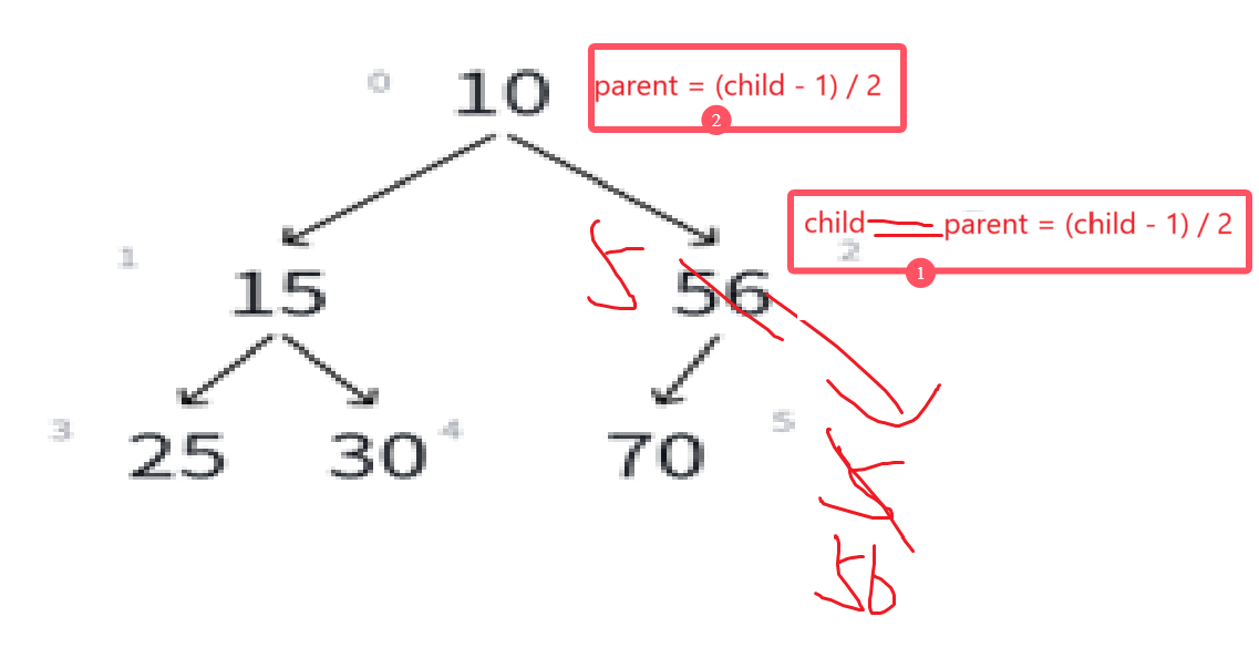 比如看最下面那个子树,左孩子25序号是3,(3 - 1)/2就是1,右孩子15序号为4,(4-1)/2就是1。非常正确。
