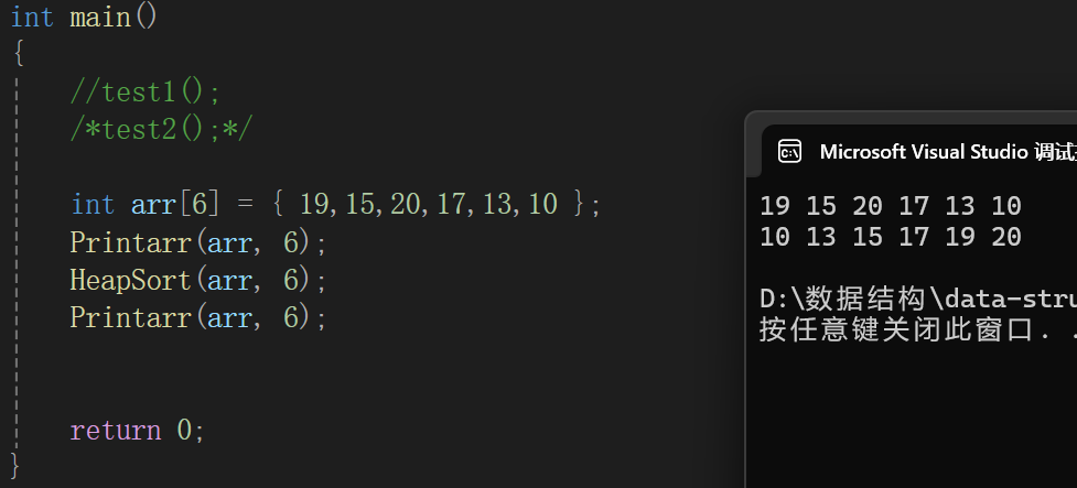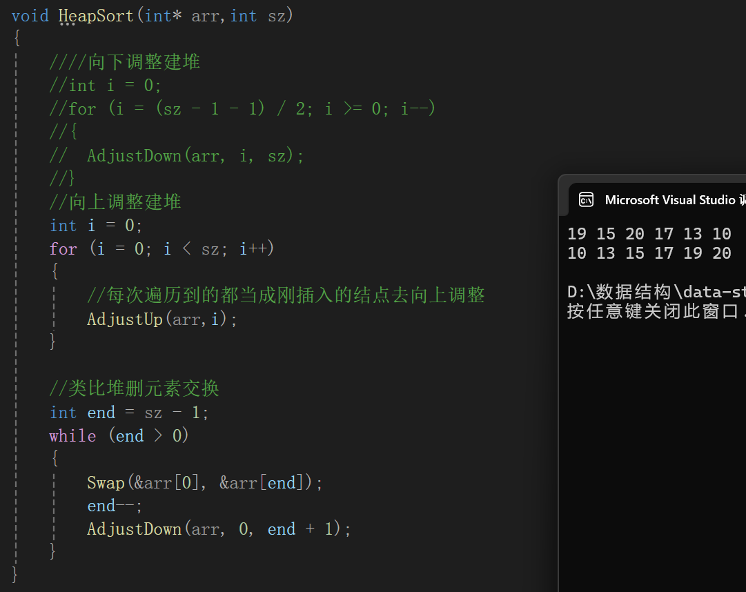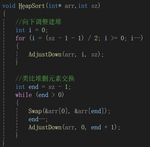 传参其实我犹豫了一下,调整的是arr数组的元素不用犹豫,parent是i也不用说,我写n的时候忘了,n代表的是数组有效元素个数,那就直接传sz就行。