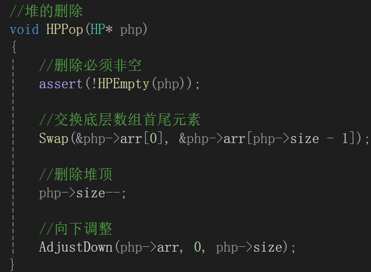 然后就是每次数组的首元素与尾元素交换,保证了极值在数组末尾以后,那个元素位置就不用再变了,就像堆删除的元素肯定不能再一起调整了,所以end--,又考虑到end作的是最后一个元素的下标,而AdjustDown最后一个参数应该是堆中有效元素个数,所以传个end + 1。