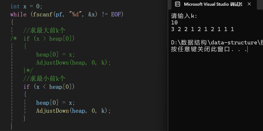 然后疯狂的读取文件后的数据(之前说过,FILE*这个结构体指针有很多类型,没读一次,指针自动后移,所以每次scanf后,就会自动移动向下一个数),如果需要调换,那就调整堆,最后一个循环不属于top-k问题,只是为了便于查看。