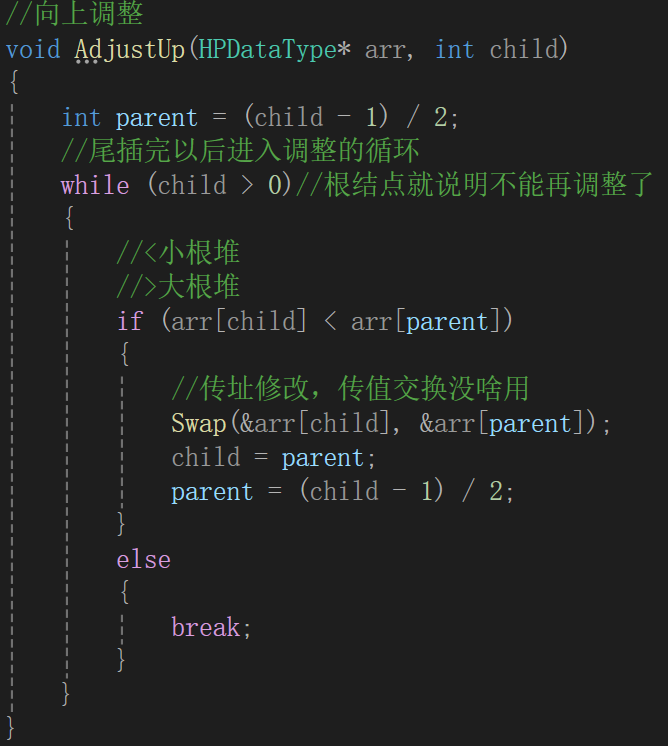 这时我们是已知child,求parent,最终parent < 0或者child == 0说明根结点都检测过了,就停止向上调整,还是一样的问题,能够向上调整的前提肯定是本身就是一个堆。