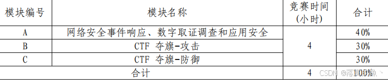 和应用安全;C:CTF 夺旗-攻击;D:CTF 夺旗-防御等四个模块。竞赛时间安排和分值权重