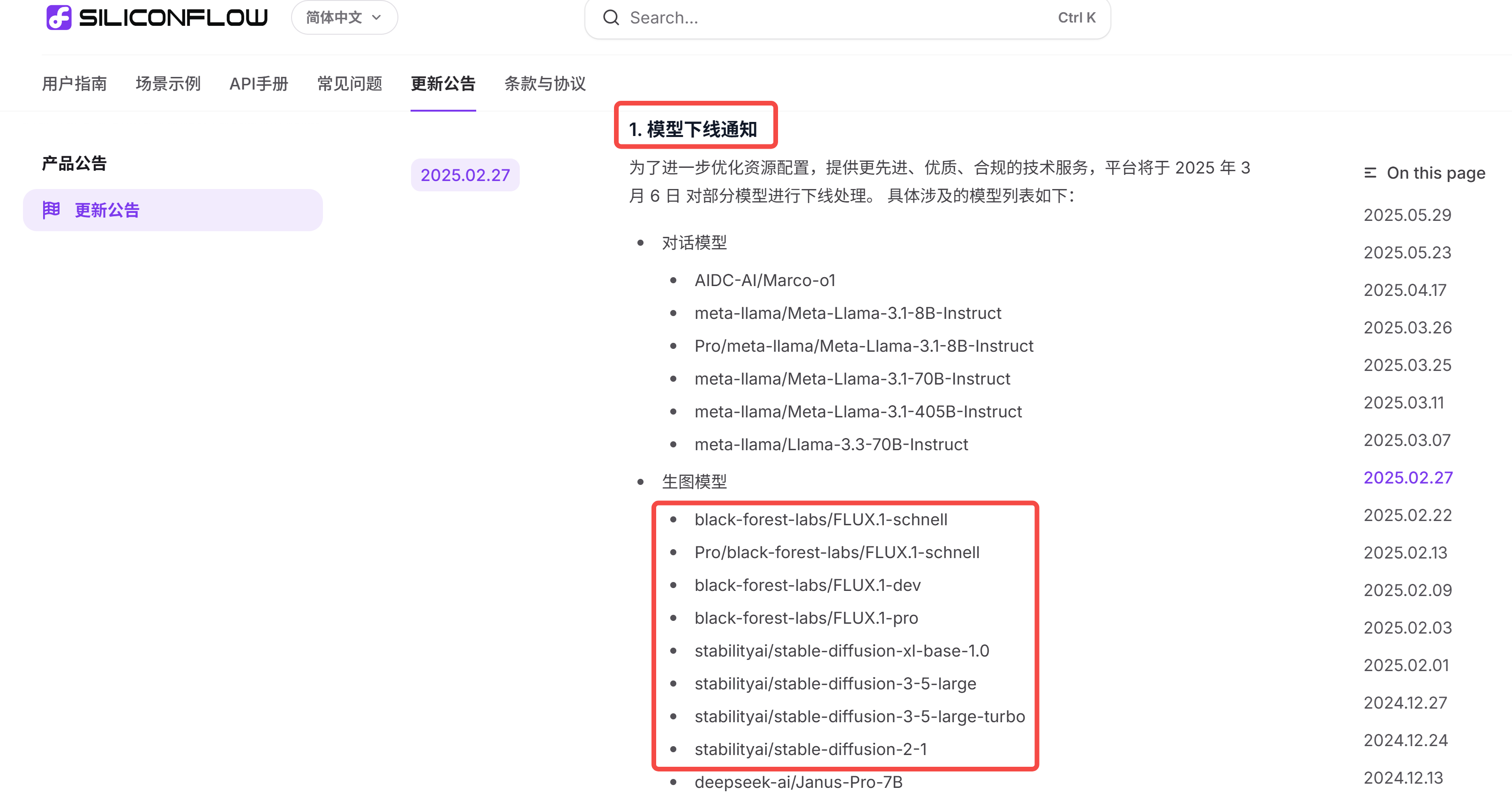 于是就 Google 了一把,发现了问题,原来是早些时候确实是能正常调用的,但是在今年 2 月份,硅基流动为了规范化运营,已经把很多大模型给下线了,其中也包括咱们要使用的 Flux 和 Stable Diffusion,这是不能调用的关键,但 Dify 中的插件并没有将这两个工具去掉,所以调用就会出现各种奇怪的报错信息,如下图所示: