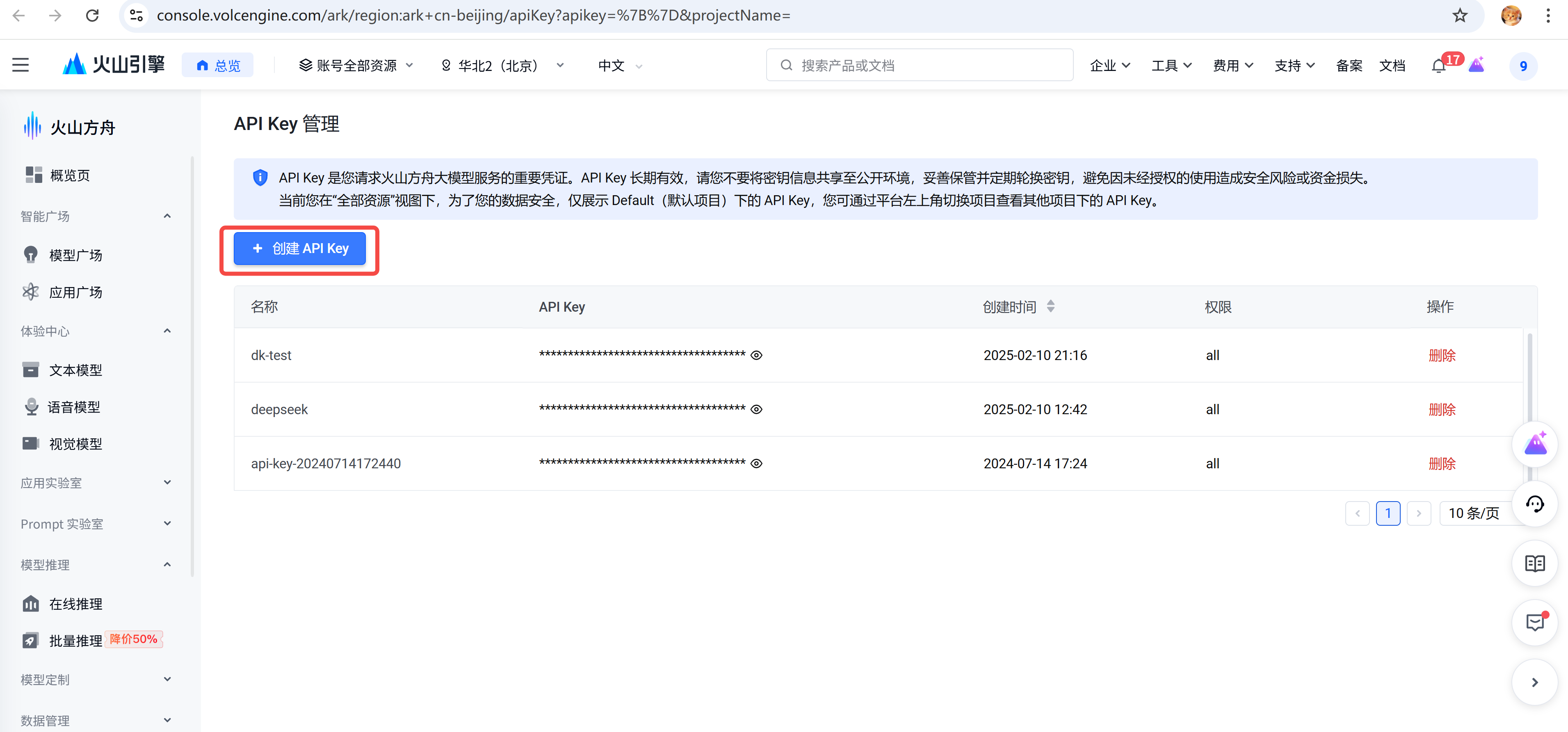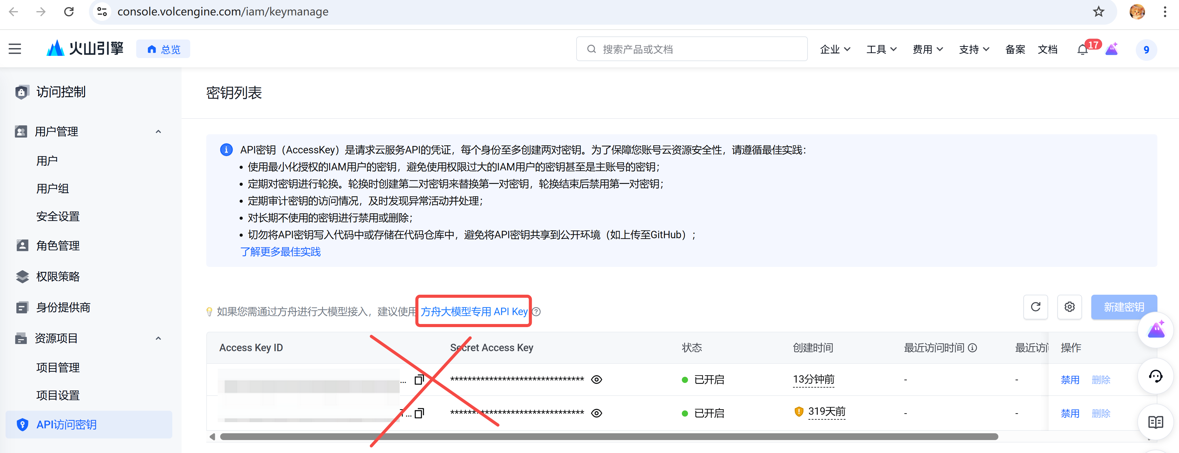 接下来是容易出错的地方,当你点击获取 API Key 有可能会到这个地址,但这个地址不对(是火山方舟不是火山引擎):