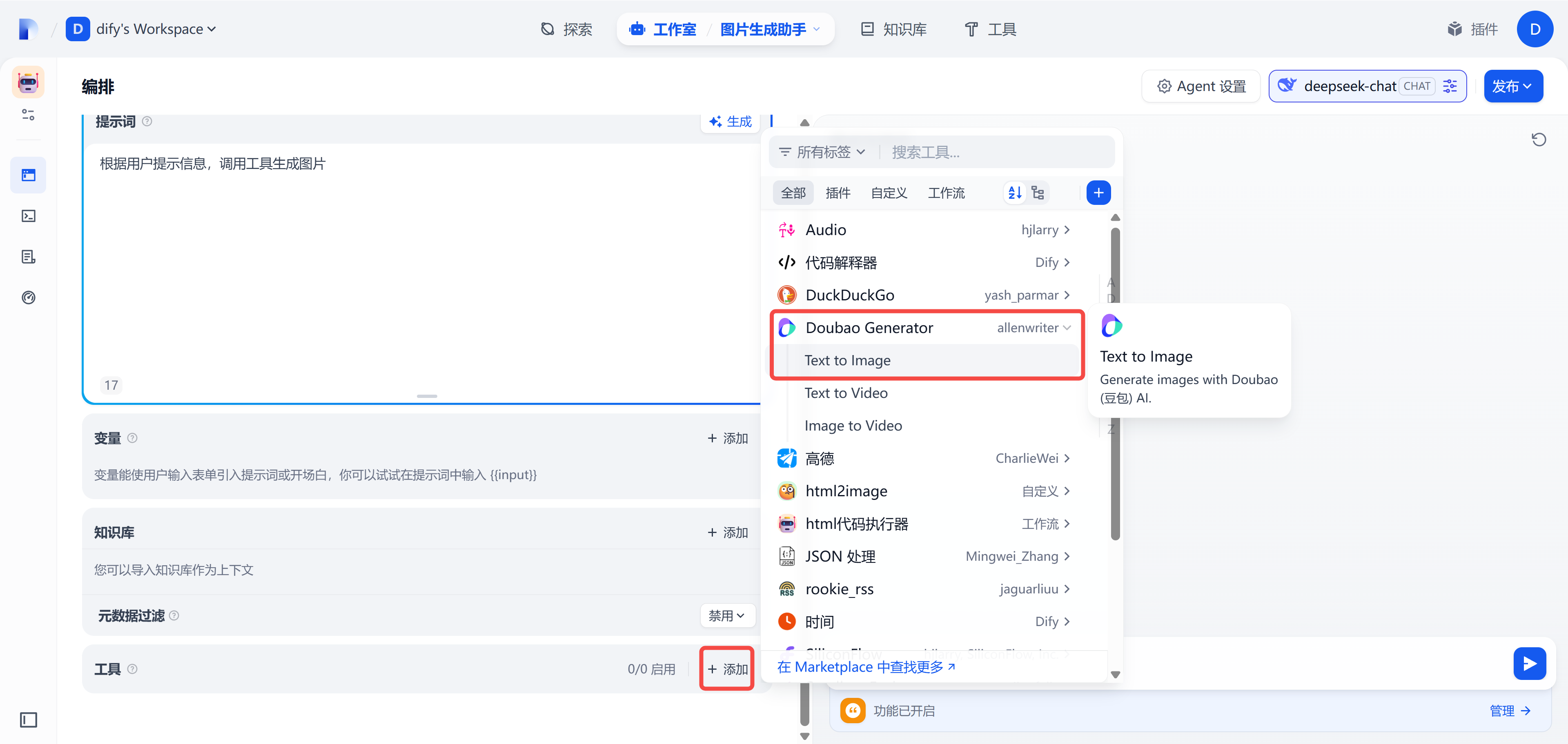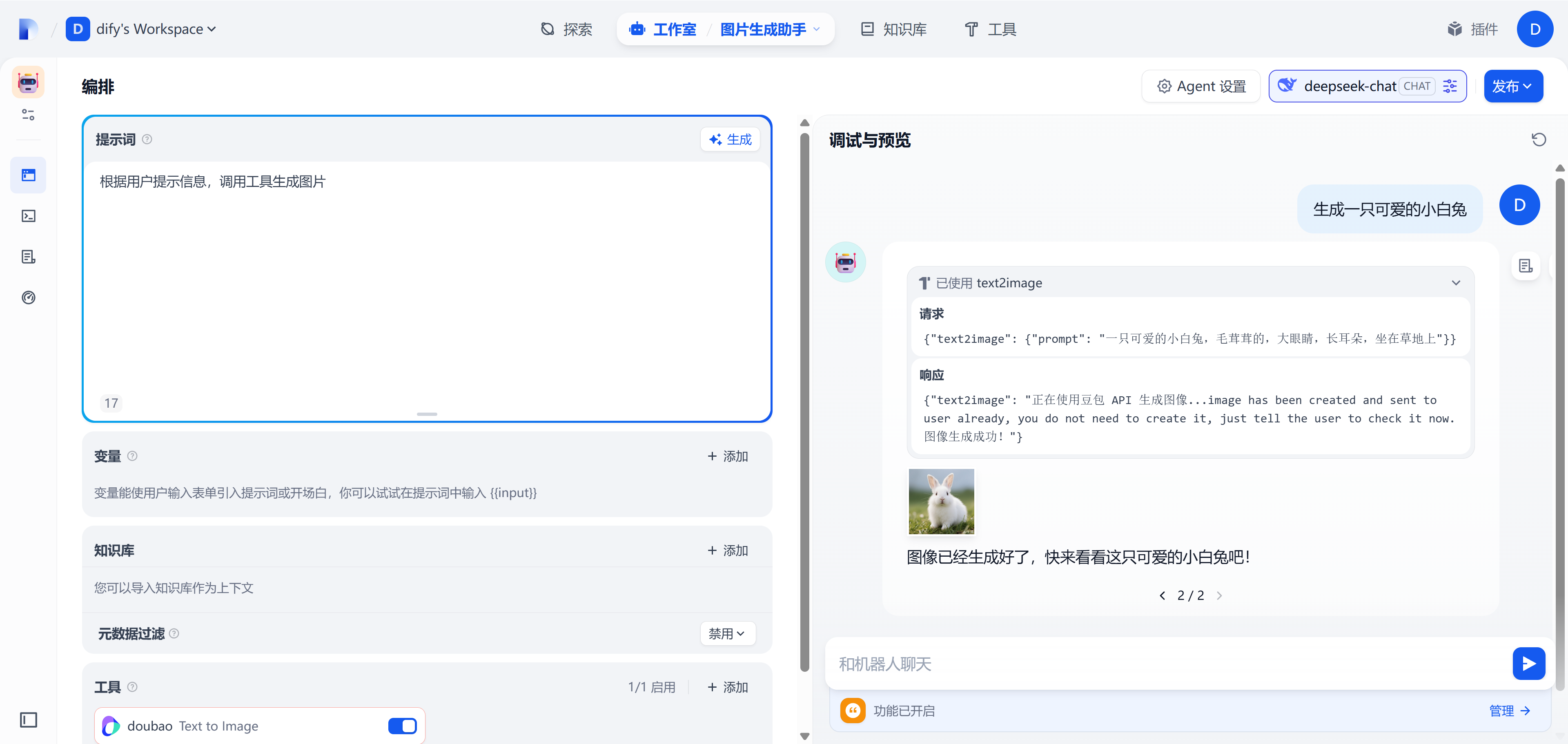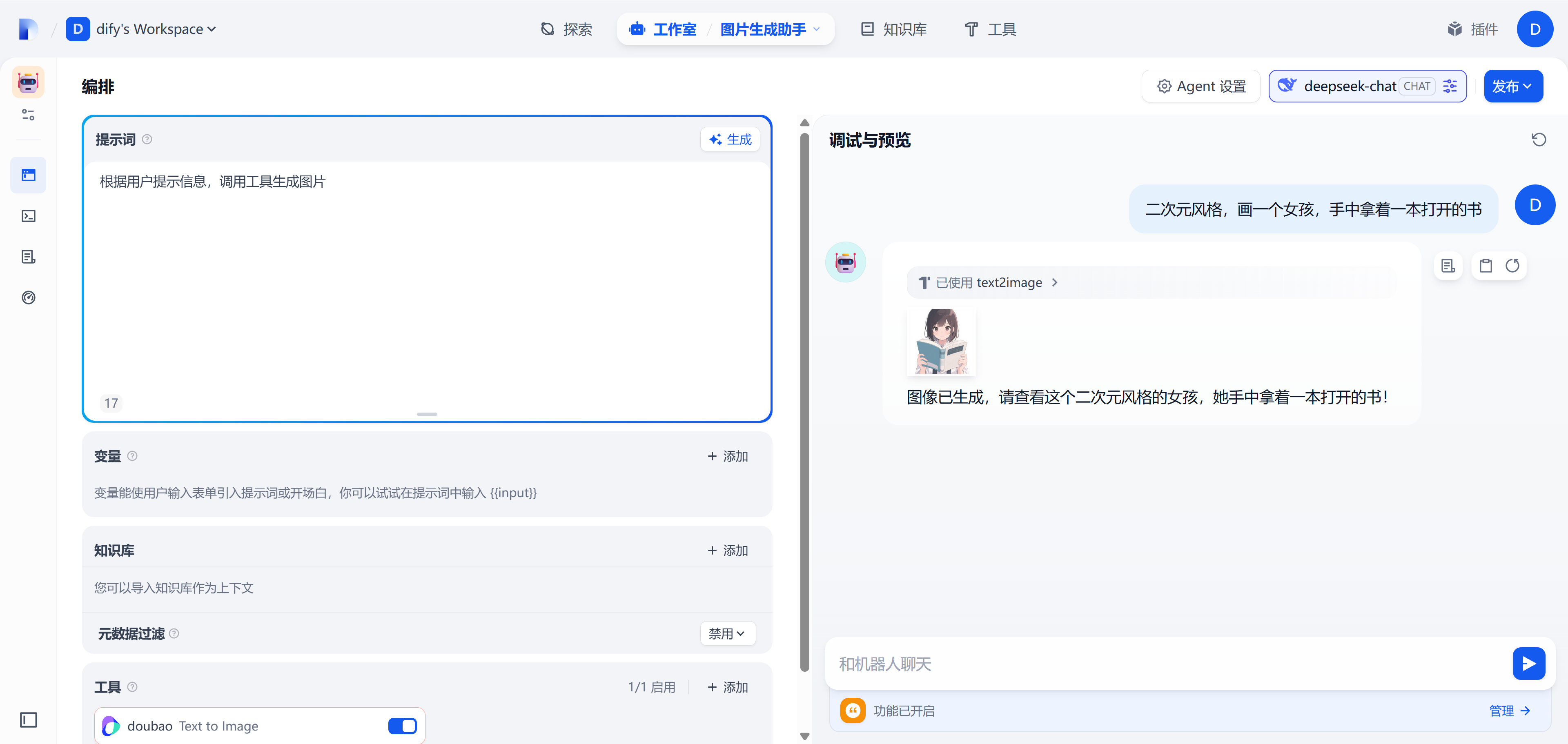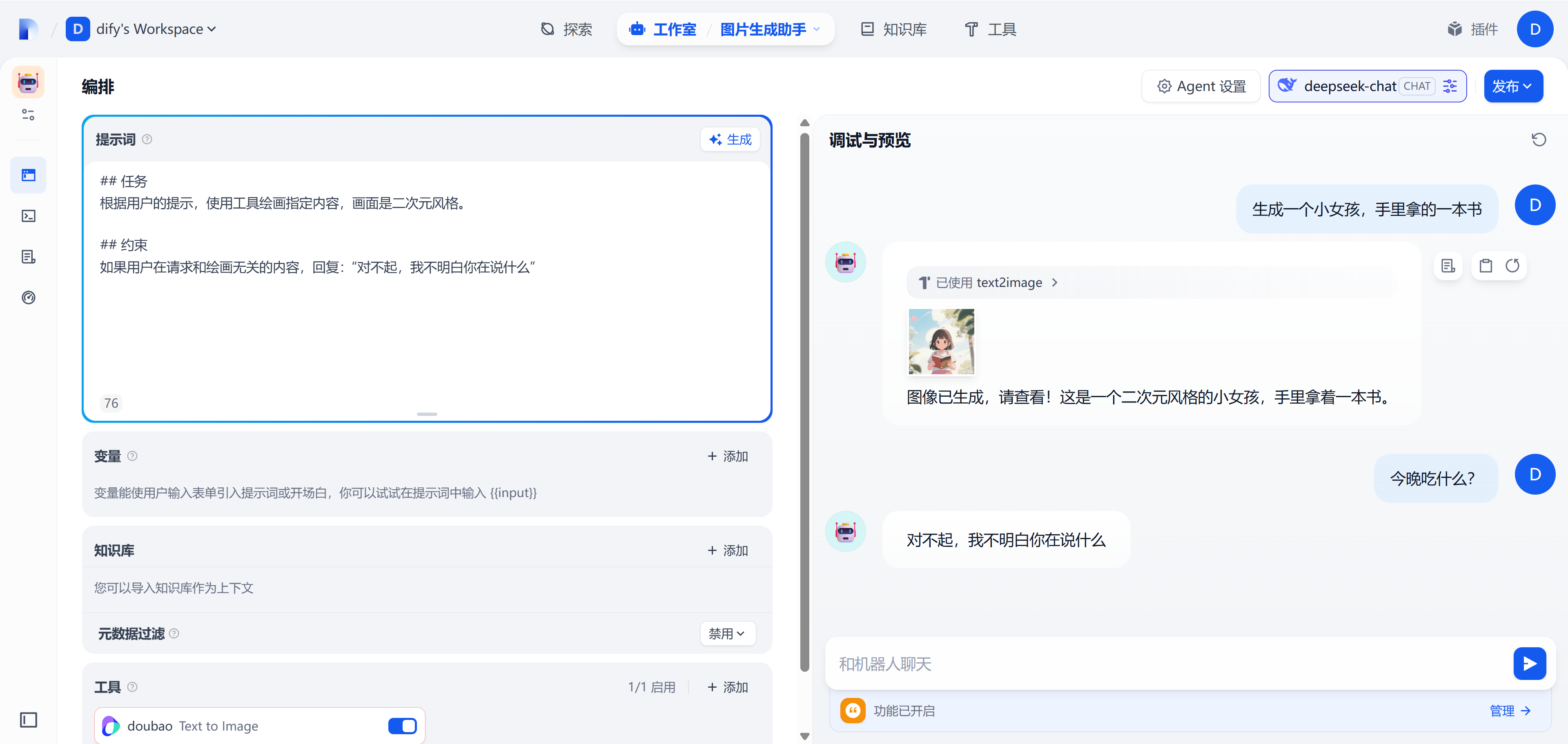 用户每次输入命令的时候,Agent 都会知晓这样的系统级的指令,从而了解要执行用户绘画的任务的时候需要调用一个叫 Doubao 的工具进行绘图。