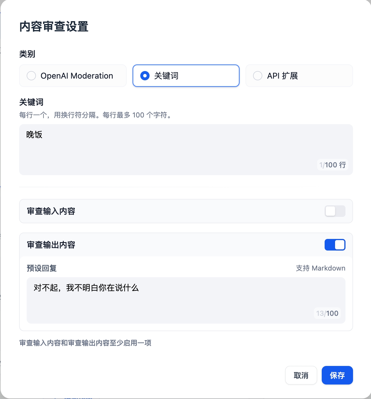 在添加功能 - 内容审查中添加关键词 "晚饭",当用户输入关键词时,则 Agent 应用输出 "对不起,我不明白你在说什么"。
