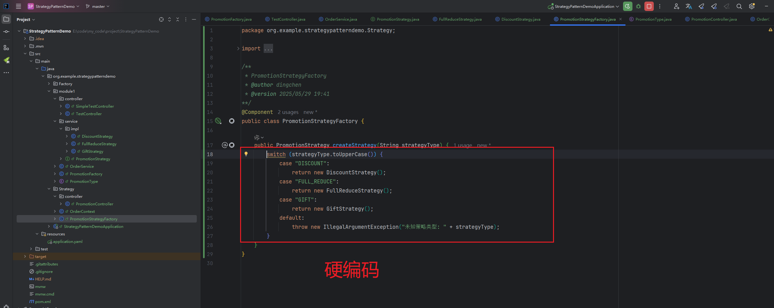 在咱们现在用的工厂类里,代码采用的是硬编码方式。这就意味着,要是有新的优惠策略类加入,就得去修改工厂方法的代码。可在开发中,频繁修改代码是我们不想看到的,因为这可能会引入新的问题,也不利于代码的维护和扩展。