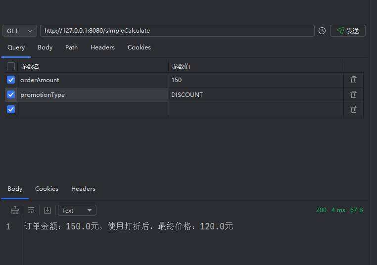 public ResponseEntity<Map<String, Object>> calculate(@RequestParam double orderAmount, @RequestParam String strategyType) {