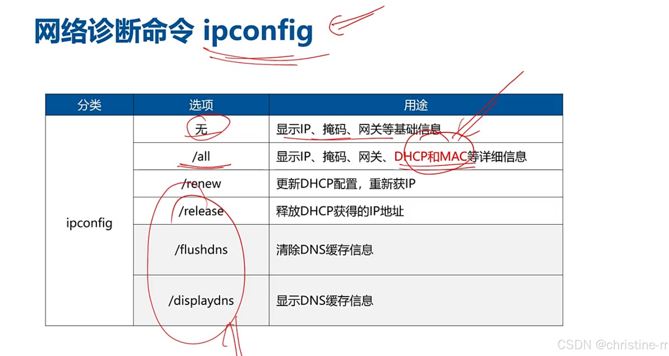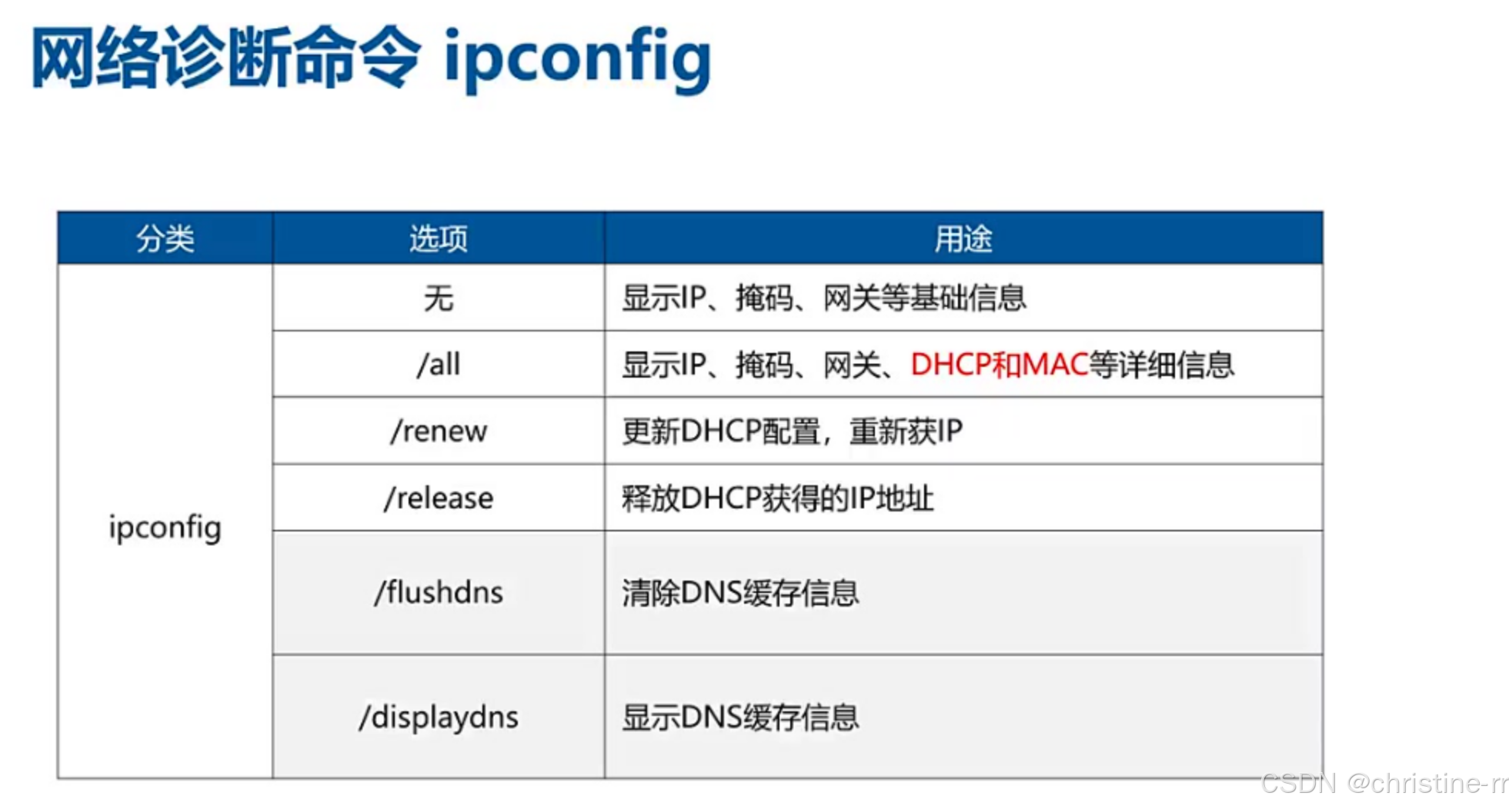 | ipconfig renew/release | release释放DHCP IP,renew重新获取 | 案例分析高频考点,第一个包超时原因:ARP解析延迟 | ⭐⭐⭐ |