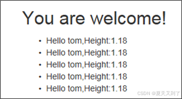 首先在页面上显示字符串"You are welcome!",然后使用一个for循环,该循环中显示的内容由@ViewBag.name和@ViewBag.h决定,并且它们的实际值由用户在URL中指定。运行项目,在浏览器地址栏中输入URL:
