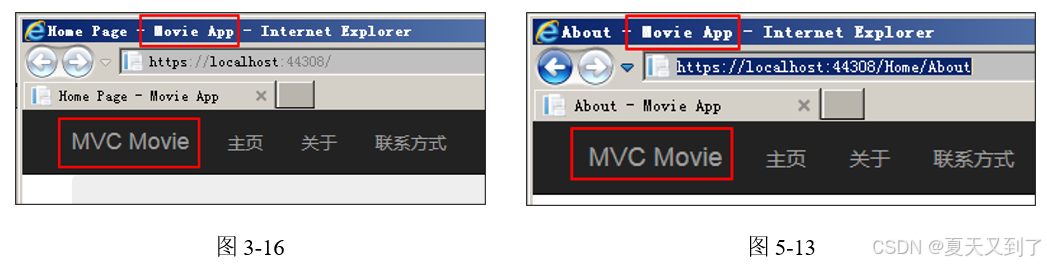 意思就是修改一下网址链接的标题。此时运行项目,我们可以看到在标题栏中的页面标题也变为"Home Page - Movie App"了,而且主页上的第一个链接名称变为"MVC Movie"了,如图3-16所示。