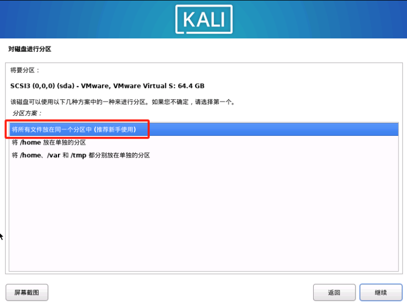 这里默认即可,点击 "继续" ,分区方案选择 "将所有文件放在同一个分区中(推荐新手