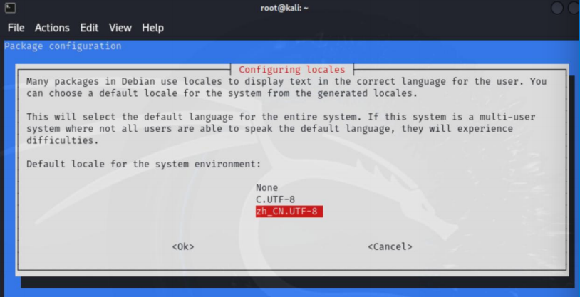 在出现的语言选择界面中,找到并选择"zh_CN.UTF-8"。通常通过空格键来选择,然后