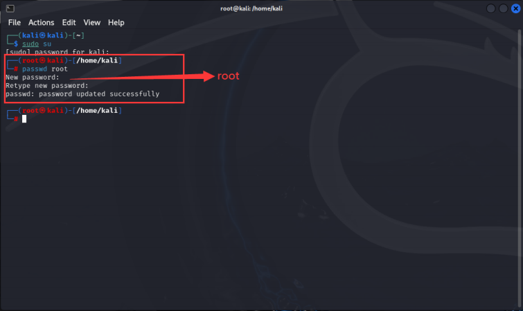 输入【sudo su】命令,再输入 kali 用户的登录密码,回车,进入到 root 终端。