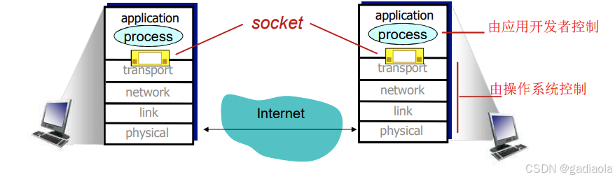 - 发送进程将报文推出门户,发送进程依赖于传输层设施在另外一侧的门将报文交付给接受进程