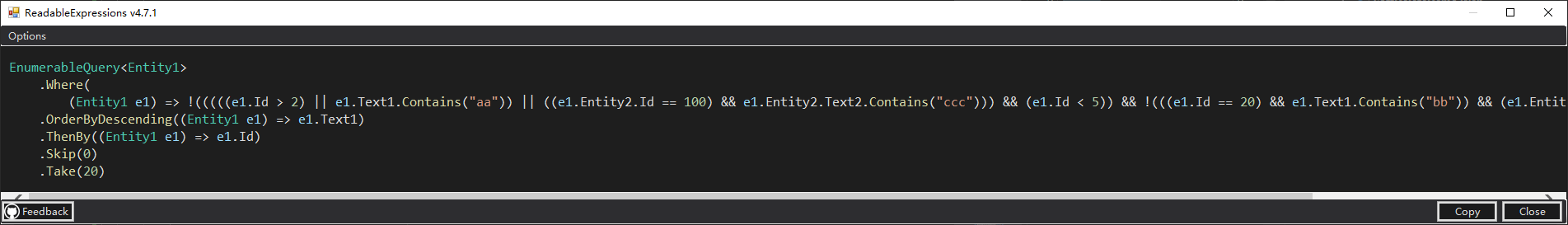 在此也推荐这个好用的VS插件:ReadableExpressions.Visualizers。这个插件可以把表达式显示成代码编辑器里的样子,对各种语法要素也会着色,调试动态拼接的表达式时非常好用。