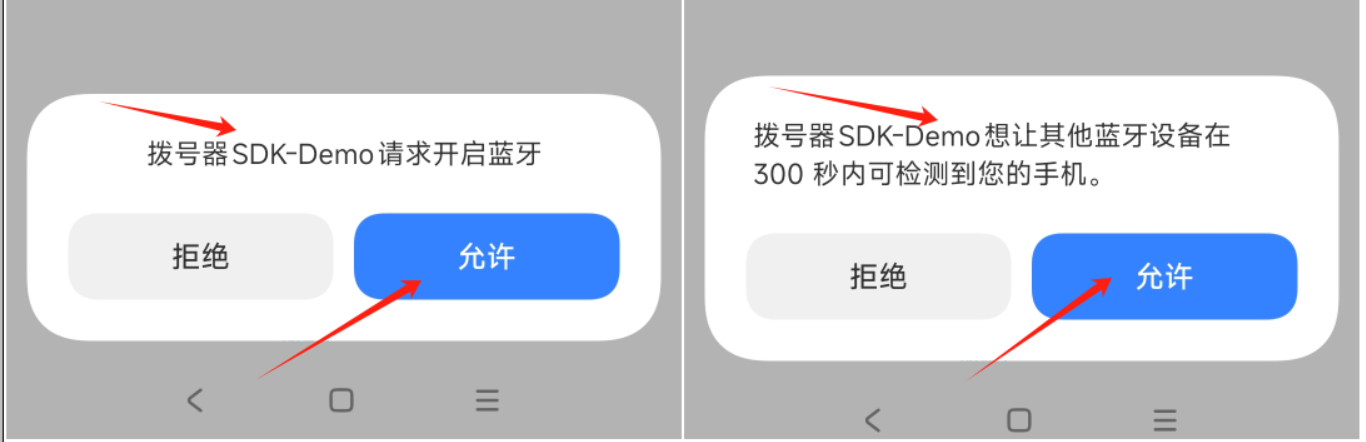 如果手机没有开启蓝牙,会先弹出框提示开启蓝牙。如果应用App首次安装且App无法获取到本机蓝牙的MAC地址,则会弹出上图右侧的提示框,允许被扫描和发现获取手机蓝牙的MAC地址(这个MAC在之后的蓝牙绑定和连接中会用到)。