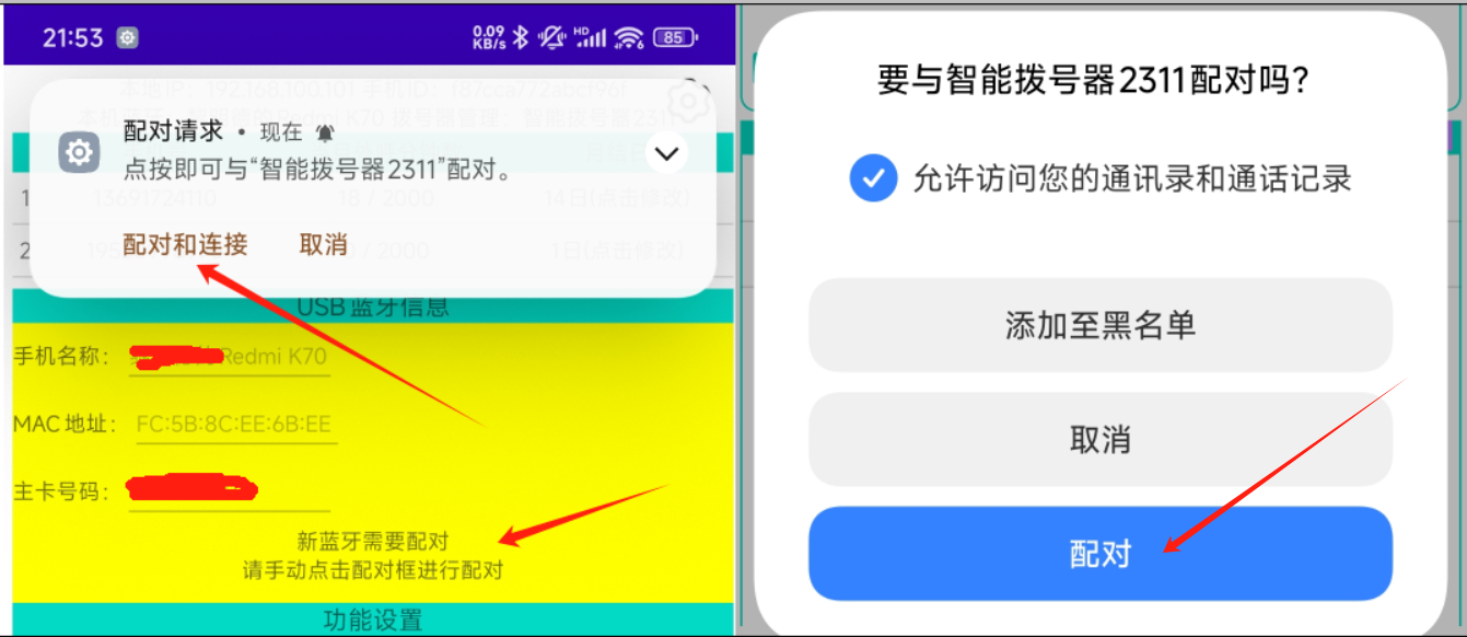若USB蓝牙和手机蓝牙首次绑定,手机还会弹出一个状态栏消息,点击状态栏消息的"配对和连接"按钮后,才会弹出蓝牙的配对框(小米红米系列手机才弹状态栏消息,部分手机会直接弹出蓝牙配对框)。