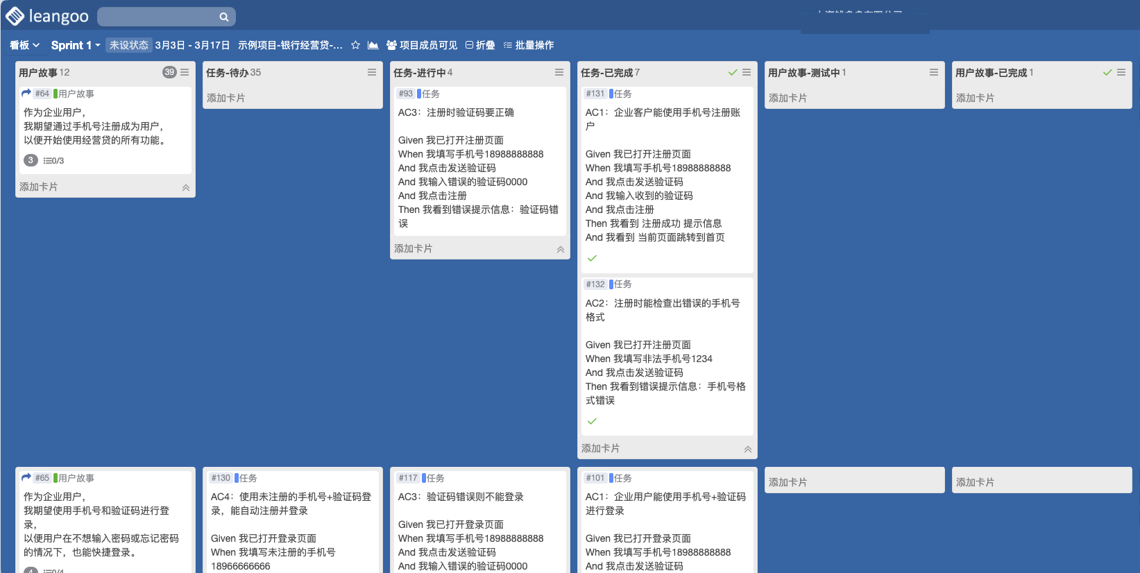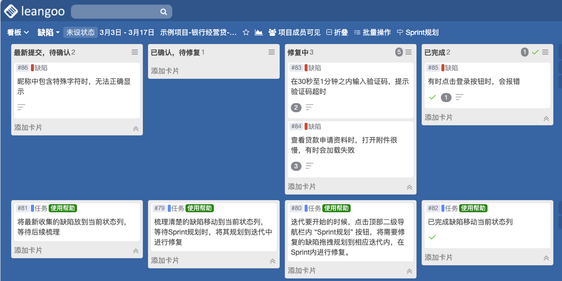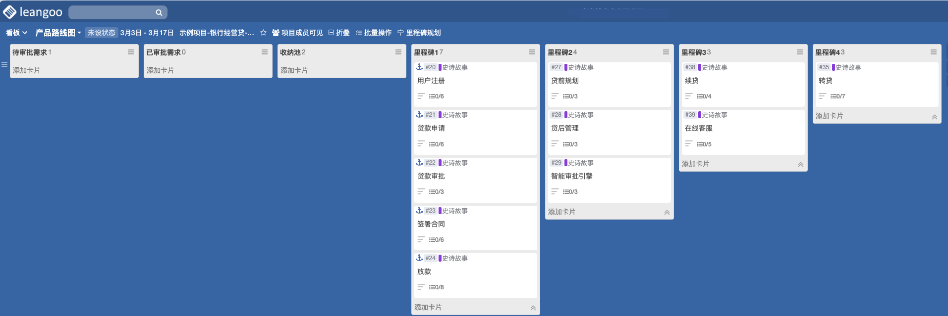 在金融数字化转型的赛道上,银行经营贷项目的成功离不开精准的需求管理、高效的任务执行、严格的缺陷管控和持续的迭代优化。上海某金融团队通过Leangoo敏捷协作平台,构建了一套贯穿"需求→任务→缺陷→回顾"的全流程管理体系。以下结合项目截图,深度解析Leangoo的四大核心应用场景。