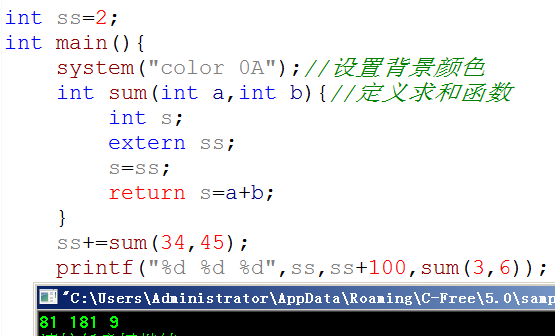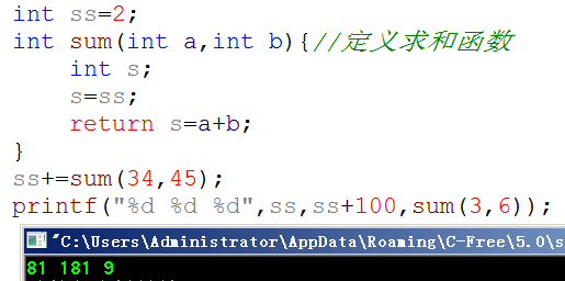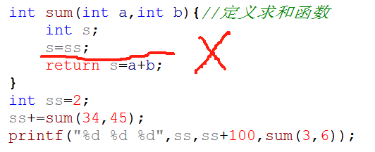 这个"int ss=2;"中ss不属于哪一个函数,属于文件,对全局有效,又称全局变量。上例中"int s;"中s只属于sum()函数,叫局部变量或动态变量。