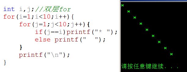 观察发现:双层循环,当i=j时,输出"*",其他输出空格,代码如下: