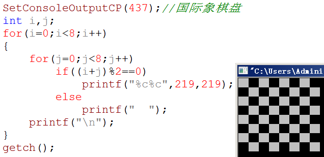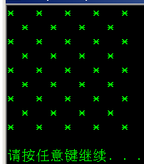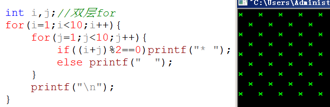 找规律:从矩阵(我们也可以叫方阵)的第一个位子开始,打一个,空一个,从左到右,再从上到下。这正好是所说"奇偶性",把i+j的和当作一个数,如果这个数是偶数,就打"*",否则打空格。条件语句可以这样写:if((i+j)%2==0)printf("* ");完整代码如下:
