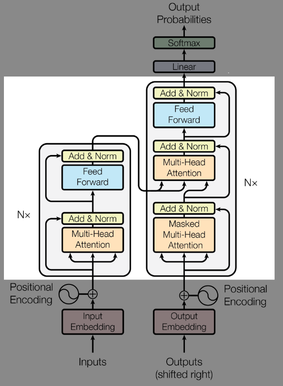输入 i n p u t s inputs inputs经过编码器处理进入解码器,上一轮的输出 O u t p u t s Outputs Outputs直接进入解码器,经过单独一层处理后与编码器输入一同处理生成新的输出。
