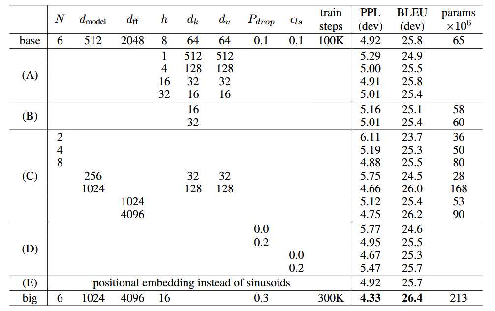 实验B表明,键 d k d_k dk减小会损失性能,作者认为相关性的建立比较复杂,如果能有比点积更好的方法可能会带来性能的提升。