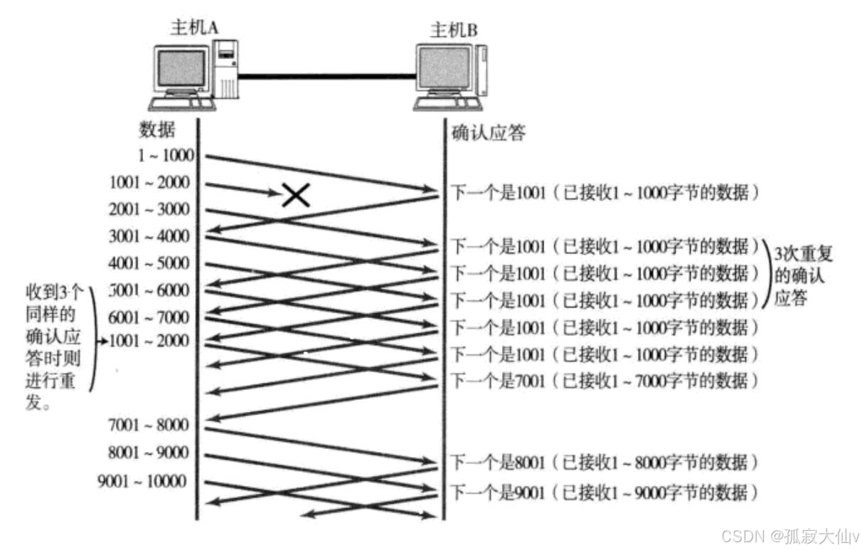 如果报文真丢了,发送端会一直收到 1001 这样的 ACK, 就像是在提醒发送端 "我想要的是 1001" 一样。如果发送端主机连续三次收到了同样一个 "1001" 这样的应答, 就会将对应的数据 1001 - 2000 重新发送。这个时候接收端收到了 1001 之后, 再次返回的 ACK 就是 7001 了(因为 2001 -7000)接收端其实之前就已经收到了, 被放到了接收端操作系统内核的接收缓冲区中。这个机制叫做快重传。