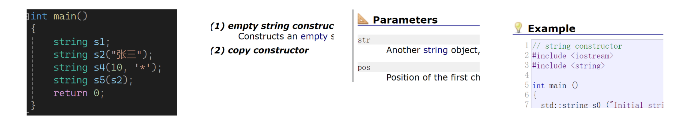 这里不用都掌握,掌握最常用的就像,不常用的有个印象,到时候需要的时候查文档就行。如上图第1个就是无参的构造,string s1,比如我现在定义个字符串但我不知道要怎么初始化,那就可以用无参的构造,其实也就是默认构造。第4个就是我现在想给一些值先初始化,string s2("张三"),这时就可以给一个常量字符串进行初始化。(文档下面也有对每个函数的说明,如第一个说的是空string构造,第四个说的是可用C的字符串初始化,C的字符串的特点是最后有/0)第6个是还可以用n个字符去初始化,string s3(10, '*'),比如我有字符串s4,要求初始化为10个*。第2个是拷贝构造,string s5(s2),比如想用s2初始化s5。