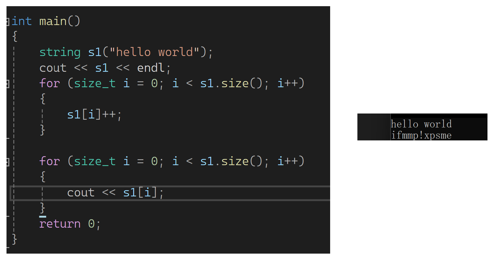 说明size不算最后的/0,因为/0是一个标识字符串结束的特殊字符。如果上面改为i <= s1.size()就可以访问到/0,只是不显示。如果想修改其中的字符可以吗?