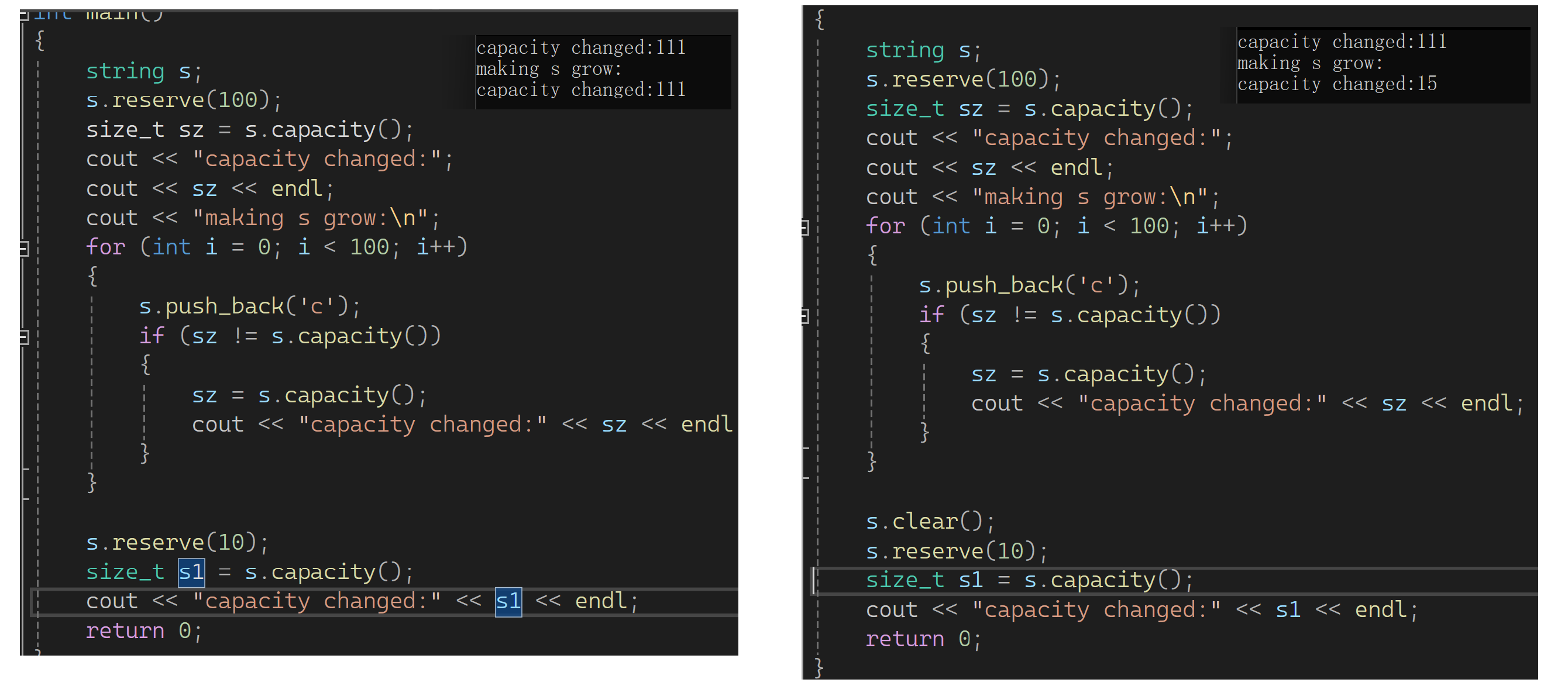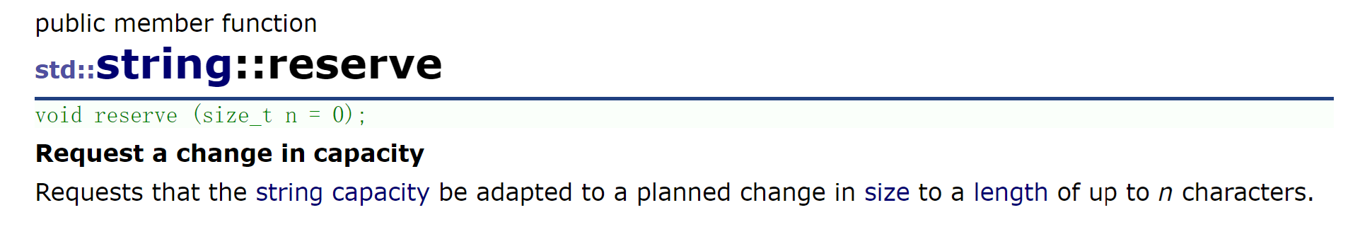 它会请求一个容量的改变。它的参数里有个n,意思是会对容量进行改变。比如我知道string要插入100个,就可以s.reserve(100):