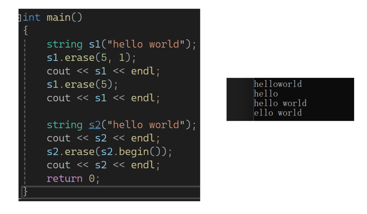 假设我想用迭代器,但不想在最开始插入怎么给迭代器呢?可以s1.insert(s1.begin()+10, 10, 'y')。再看看erase,它可以支持从pos位置删除len个字符,如果len给多了或者不给就用npos,此时用多少删多少;还可以传迭代器,比如完成头删;下面演示一下:
