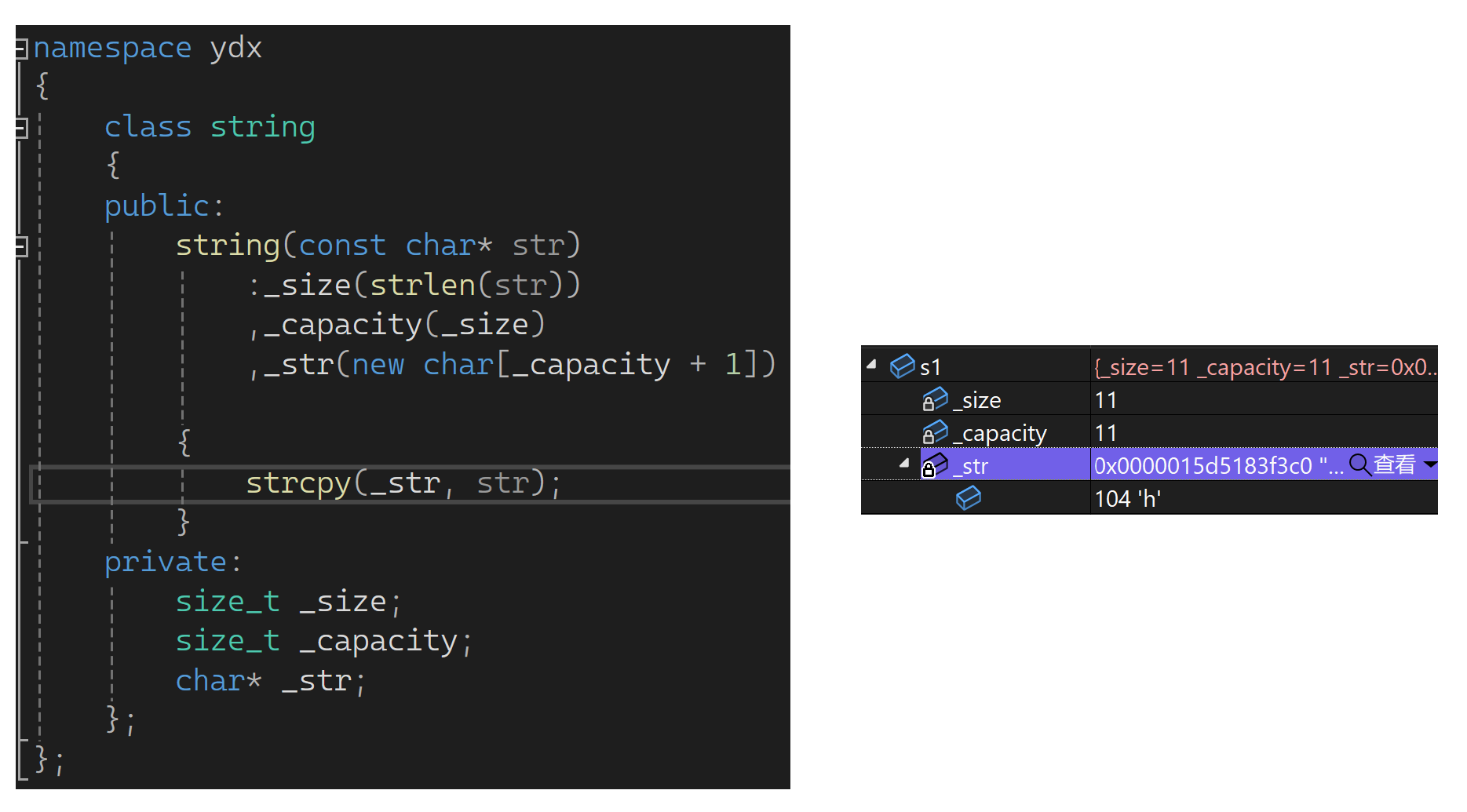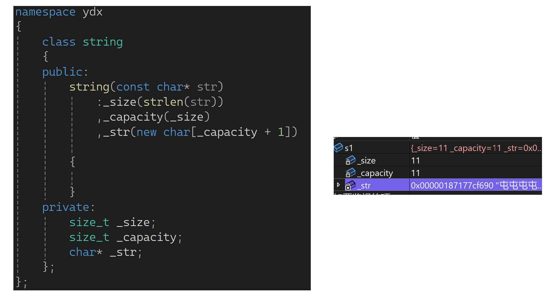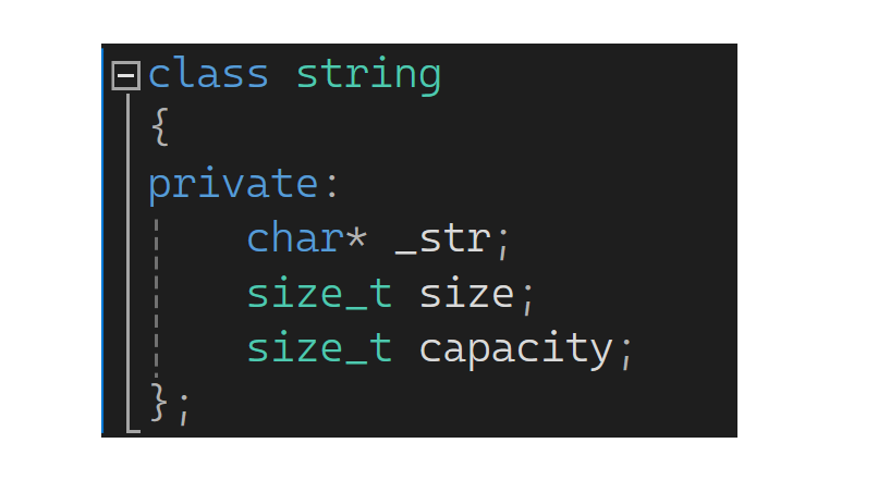 发现还是比较好用的。C语言中有strcat也可以尾插,但它每次先找到/0才能添加效率比较低,而且strcat不能自动扩容。string最大的好处是只管追加,空间不够交给对象,这里先提一下,对象里面其实大概是这个样子: