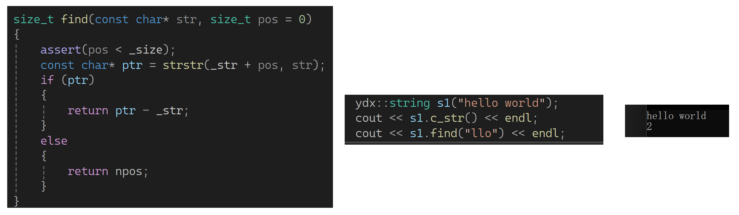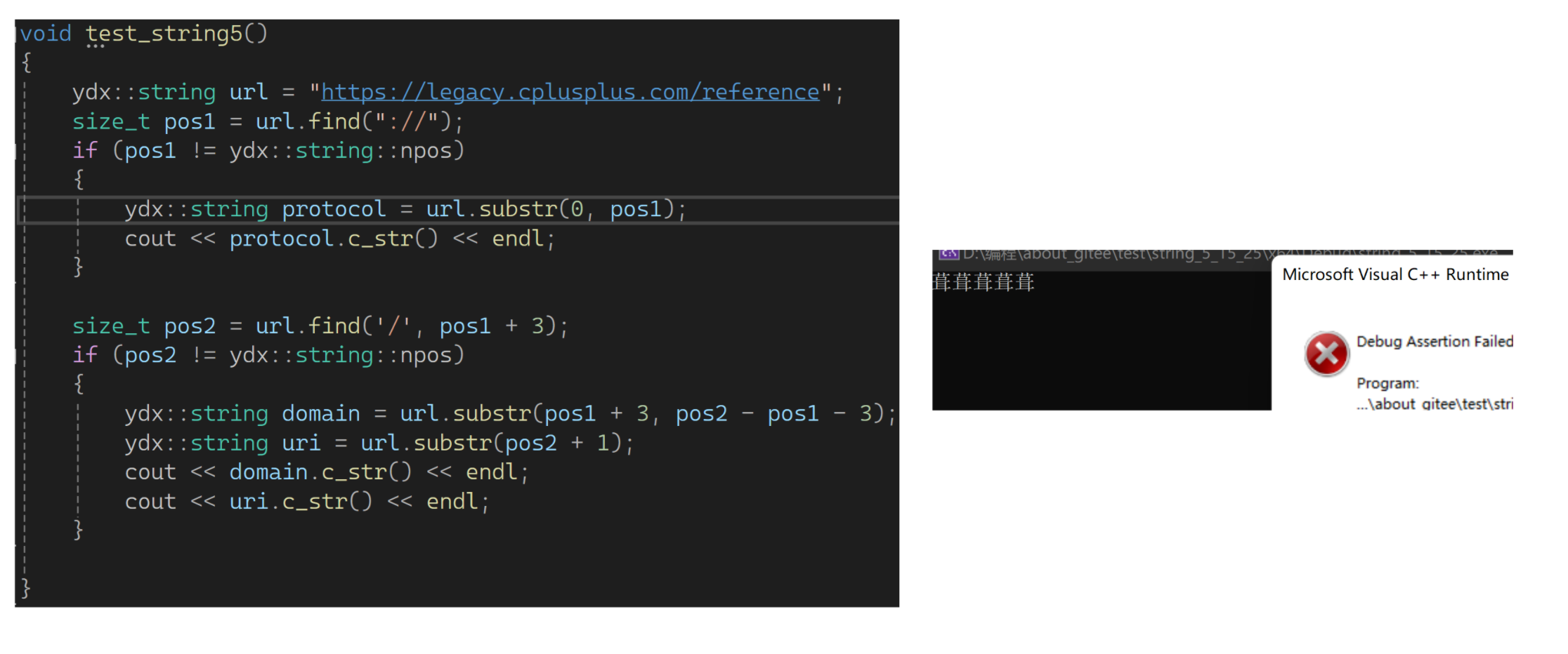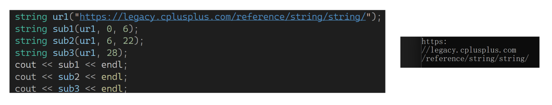 可以find一个字符(4),find一个字符串(2),find一个str(1),pos这里还给了一个缺省参数,意思是从pos位置开始搜索,默认是从0开始搜索。所有网址都有个特征是以://开头,所以就先size_t pos1 = url.find("://"),find会返回匹配到的第一个字符的位置,如果没有找到就返回npos。找到后先要取出协议部分,可以用构造里面拿某一部分来构造,除了构造还可以用substr: