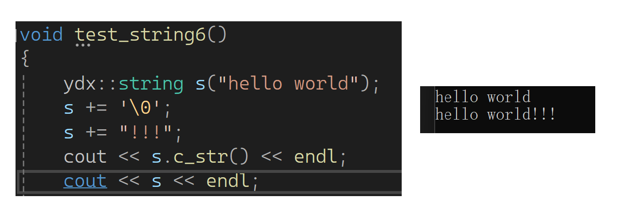 这两种写法的意义不一样,上面是调的string的流插入;下面是识别为char*,调的库里对这的支持。它的作用是和c的一些接口函数配合: