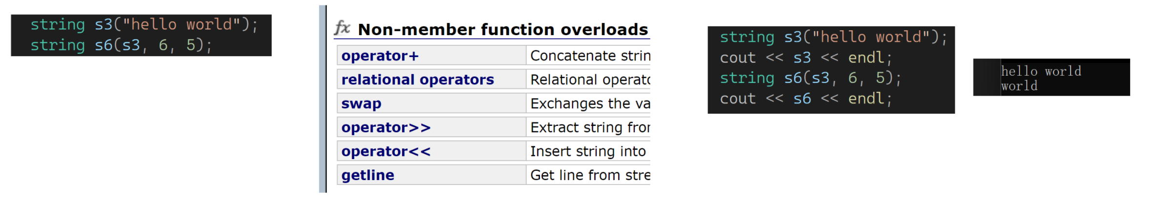 以上就是最常用的,文档中有功能介绍,参数介绍,还有样例。还有几个没介绍的,这里浅浅的说一下它的功能(stl这里可以看名字去蒙功能),如2是完全拿string去拷贝,3是拿string的一部分去拷贝,是从某个位置开始拷len这么长,这里可以试一试: