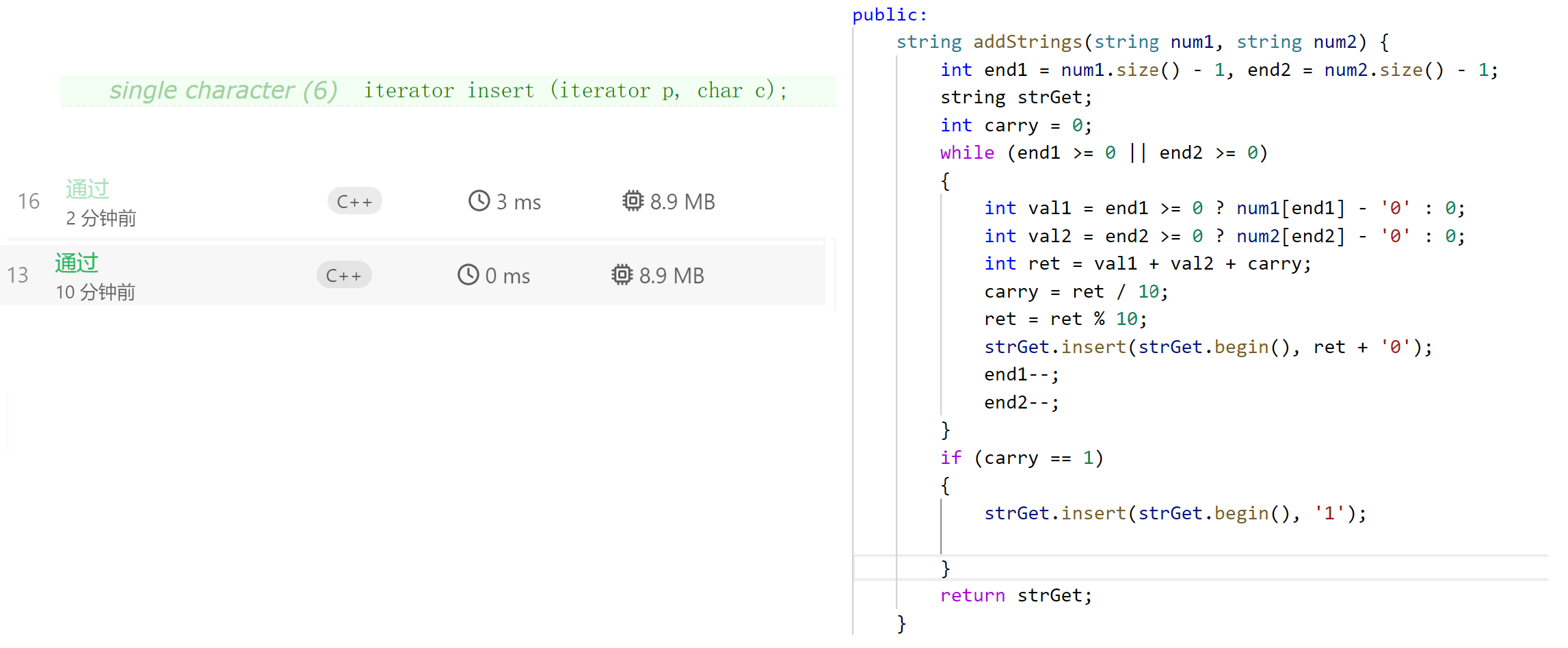 这样提交后还有问题,如果两个串中只有一个值,那最后依然要把进位值加上,所以最后判断一下如果出来后carry是1,那就加字符1: