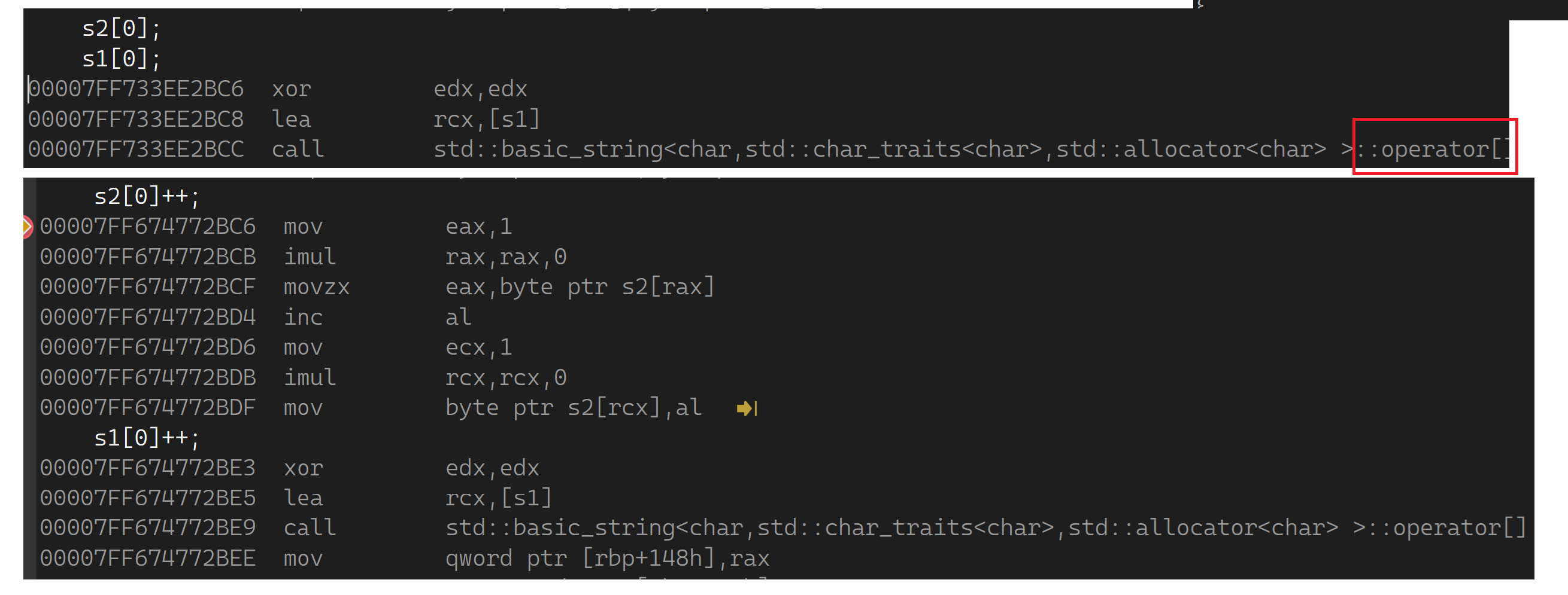 这里s2只读编译器优化比较严重,可以++一下再看底层,可以看到s2是一些解引用计算,s1是一些函数调用。