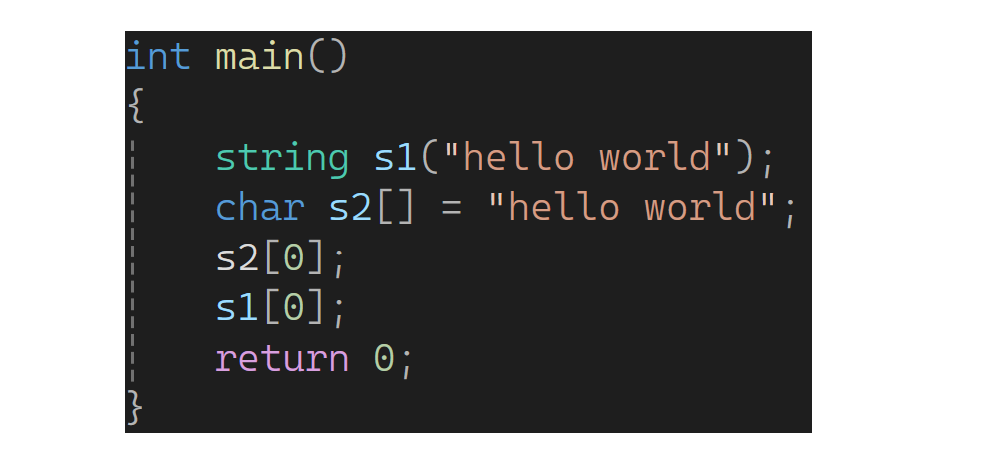 看起来一样,其实底层天差地别。s2[0]中s2是数组名,代表首元素的地址,底层等价于*(s2+0)。s1[0]的底层是自定义用这个运算符时变为s1.operator[](1),这个s1[0]表达式读的时候读的是函数调用的返回值。可以看看底层: